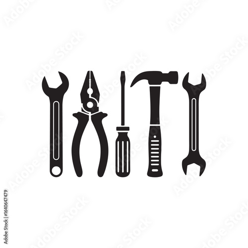 Collection of common hand tools including wrenches pliers screwdriver and hammer
