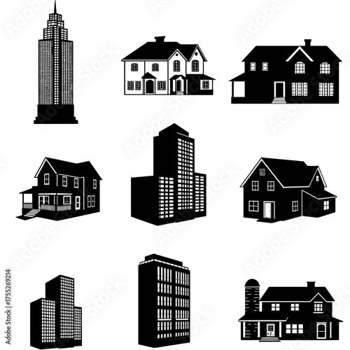 Collection of diverse building silhouettes including skyscrapers and residential houses ideal for design projects