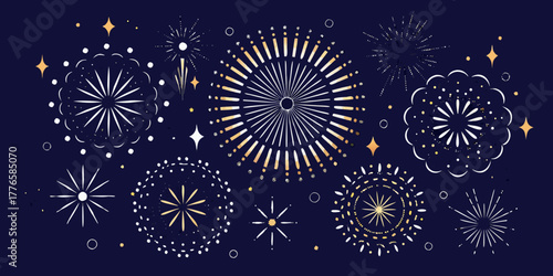 Collection of festive fireworks and sparkling stars in white and gold on a dark blue background