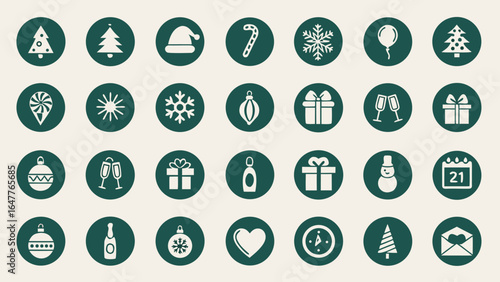 Collection of Festive Teal Circle Christmas Icons: Winter Holiday Symbols, Gift Presents, Trees, Snowflakes, Champagne Flutes, Ornaments, and More for Digital Design Projects.
