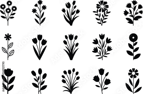 Collection of fifteen black and white flower and plant illustrations