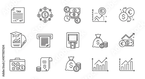 Collection of financial linear icons including taxes, investments, and currency symbols in a clean and modern design.