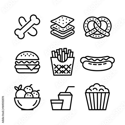 Collection of food and drink icons in black and white minimalist outline style featuring fast food snacks and healthy options