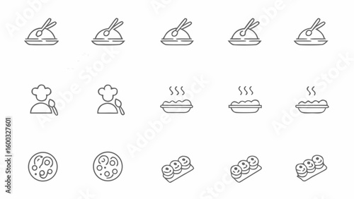 Collection of food icons including soup chef pizza and sushi in a simple line art style design silhouette
