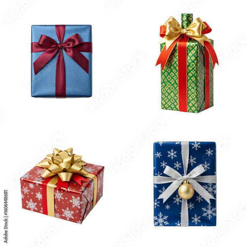 Collection of four colorful Christmas presents. Beautifully wrapped gift boxes with bows isolated on a transparent background. Holiday celebration concept.