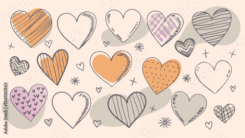 Collection of hand drawn hearts with various patterns and colors on a light background