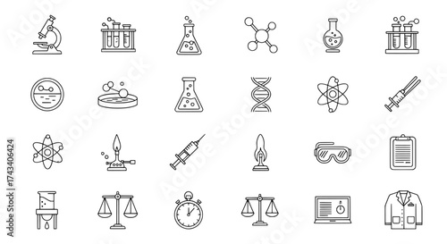 Collection of hand drawn medical and scientific icons representing healthcare research and innovation in a clean white background