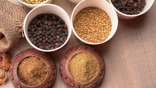 Collection of indian Spices and herbs. Food and cuisine ingredients on wooden background.