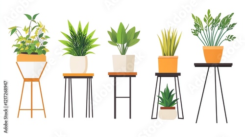 Collection of indoor plants in stylish pots on stands, white isolate background.