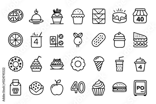 Collection of line icons depicting snacks chips nuts and sweets isolated on transparent background