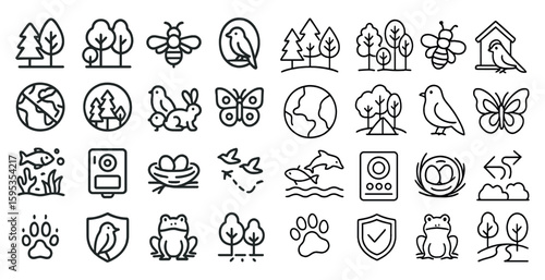 Collection of nature-related icons, including trees, birds, and butterflies. The icons are arranged in a grid, with some overlapping each other