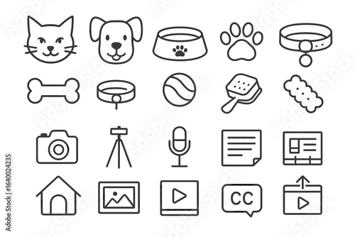 Collection of pet line icons including cat, dog, accessories, and media equipment