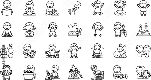 Collection of simple line art illustrations depicting happy children engaged in various activities like reading playing with blocks science experiments and gardening