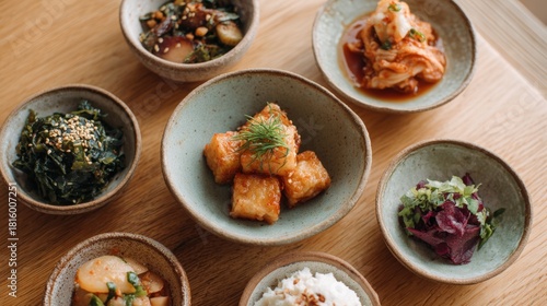 Collection of six small bowls of different types of food arranged on a wooden table. there are six bowls in total, each containing a different type of dish.