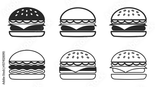 Collection of six stylized hamburger icons in black and white outline and solid fill