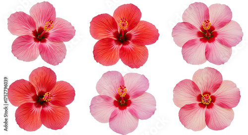 Collection of Six Vibrant Hibiscus Flowers in Pink and Red Hues.
