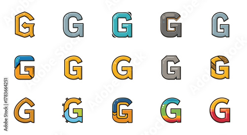 Collection of stylized letter G monograms and logos in a cartoon illustration style, featuring diverse color palettes and unique designs, presented as an ordered set on a clean white background for