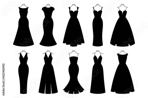 Collection of ten elegant black dresses displayed on hangers in a minimalist style design