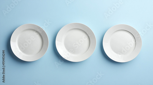 Collection of three white round empty plates isolated on pale blue background