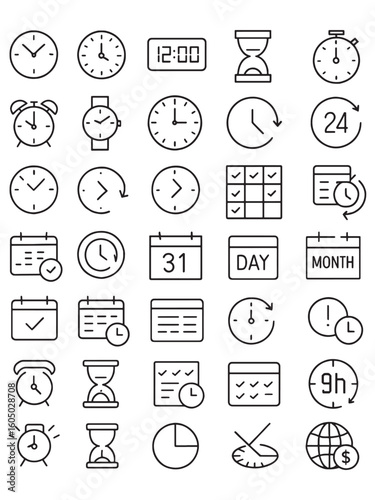 Collection of Time Related Icons Representing Various Aspects of Time Management and Scheduling, Depicting Clocks, Calendars, and Deadlines