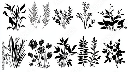 Collection of twelve black silhouette illustrations of various plants and foliage, isolated on white background.