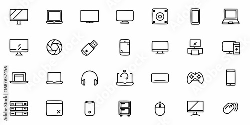 Collection of various electronic devices and computer peripherals in black and white outline style