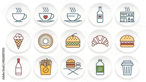 Collection of various food and drink icons on white circles isolated on white background, including coffee, burger, and fries
