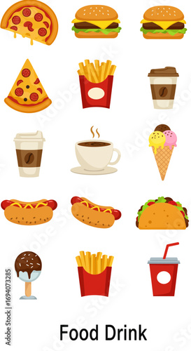 Collection of various food and drink items, including pizza, burgers, fries, coffee, ice cream, hot dogs, and tacos.