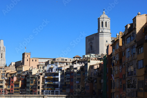 Colored houses on the river Onyar against the background of the cathedral in Girona, Catalonia, Spain