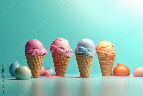 Colored ice cream cone on blue background, digital illustration. Generative AI