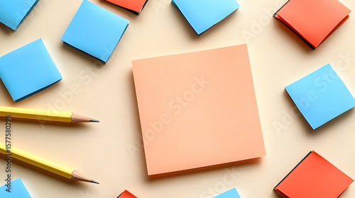 Colored square blocks and pencils surrounding a blank peach-colored square note on a beige background.