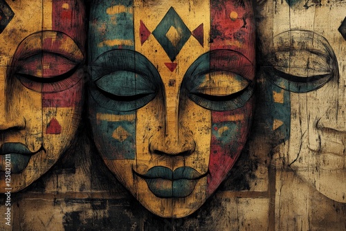 Colorful abstract art featuring faces with intricate designs and patterns created on a wooden surface in a vibrant style