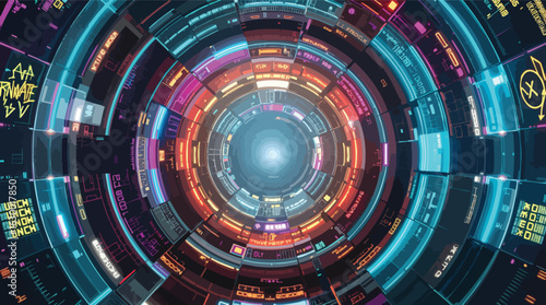 Colorful abstract futuristic tunnel design illustrating data flow and digital technology visualization.