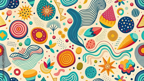 Colorful abstract shapes and lines on a light background, creating a playful and whimsical pattern, abstract, colorful