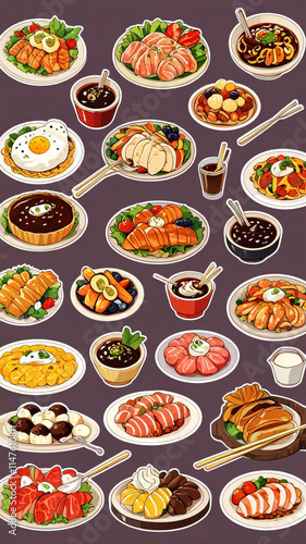 Colorful and creative food illustration of rice, beef, egg, shrimp, salad, and soup on a plate and bowl in a vibrant style
