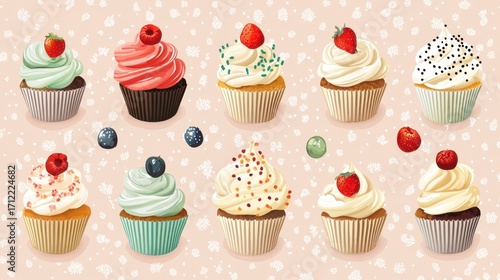 Colorful and Delicious Assortment of Cupcakes with Various Frosting and Toppings on a Soft Background
