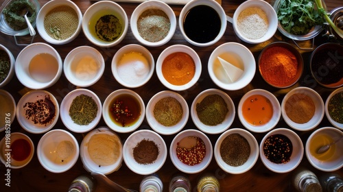 Colorful and varied cooking ingredients, including spices and sauces, displayed on table. Bright indoor lighting.