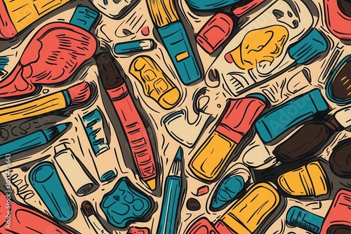 Colorful assorted art supplies scattered in a creative, hand-drawn style background. Ideal for education and creativity themes.