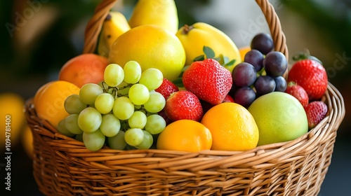 Colorful assorted fruits in a wicker basket.