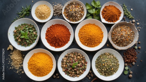 Colorful Assortment of Dried Spices and Herbs in Bowls Arranged Artfully on a Dark Surface