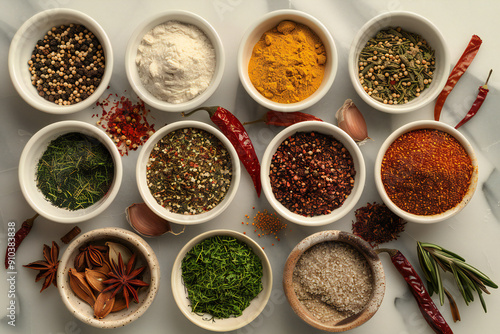 Colorful Assortment of Spices and Herbs in Bowls - Aromatic Seasoning Ingredients for Gourmet Cooking and Ethnic Cuisine