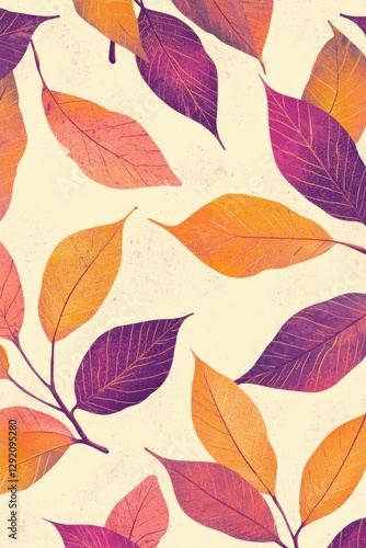 colorful autumn leaves pattern with vibrant orange, purple, and pink hues on light beige background. fall season concept. textile design, wallpaper, greeting card.