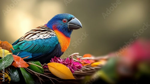 Colorful bird is perched on a branch with leaves and flowers around it. The bird is blue and orange, and it is enjoying the colorful surroundings. Concept of peace and tranquility