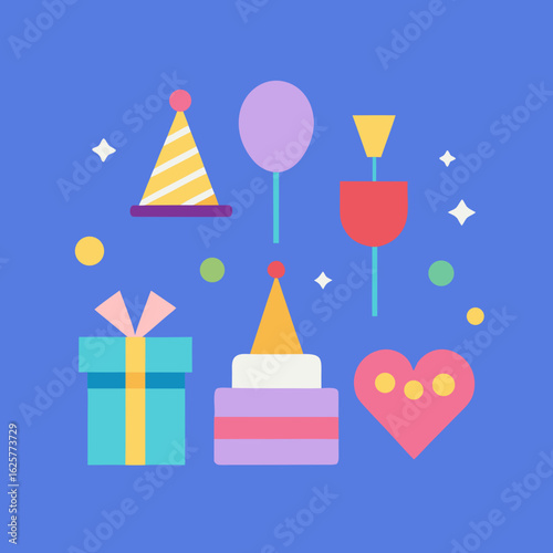 Colorful birthday party elements on a blue background