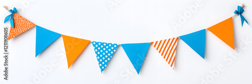 Colorful bunting party decoration with triangular flags in various hues, isolated on white background