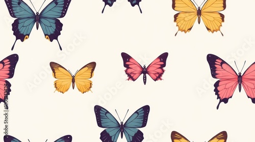 Colorful butterfly pattern with various species and vibrant colors on a light background