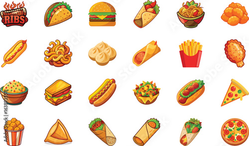 Colorful Cartoon Fast Food Icons Collection Featuring Burgers, Pizza, Tacos, Wraps, Fries, Snacks, and Street Food Items on White Background