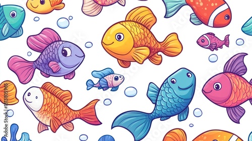 Colorful cartoon fish pattern, underwater scene, fun design, stock illustration