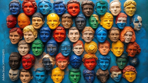 Colorful ceramic masks depicting diverse human faces on a vibrant background.