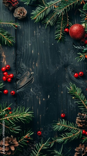 Colorful Christmas ornaments and green tree branches rest against a rustic black wooden background, combining bright festive cheer with seasonal elegance and winter spirit